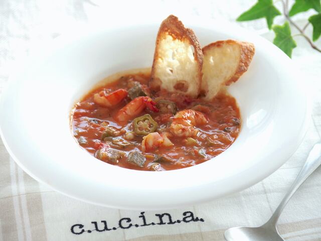 えびの旨味たっぷりのスパイシースープ。コク深いチリやとろとろオクラで美味しさアップ!